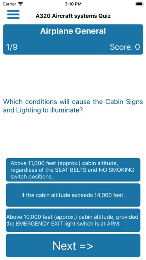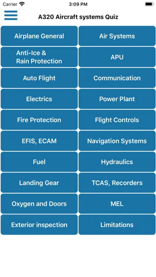 - System Quiz over 430 questions: The following topics are covered: Airplane general, Air systems, Anti-ice and Rain protection, APU, Auto flight, Communication, Electrics, Power Plant, Fire protection, Flight controls, EFIS, ECAM, Navigation systems, Fuel, Hydraulics, Landing gear, TCAS, Recorders, Oxygen and Doors. I also added few general questions for Exterior inspection, MEL and Limitations.