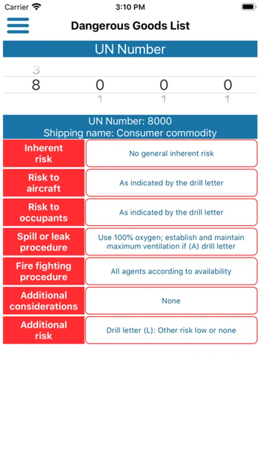 - Dangerous Goods (by UN Number): You can choose any UN number by the number picker and instantaneously get the description and the drill for it.