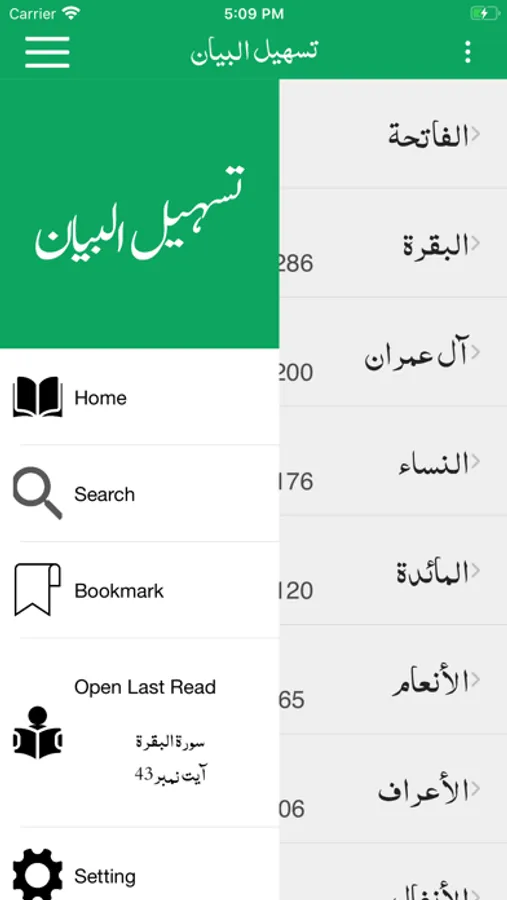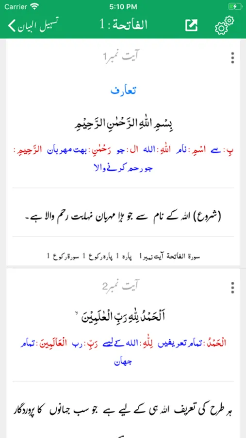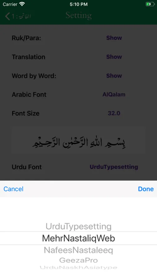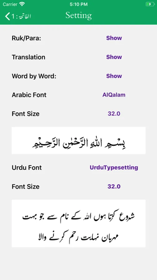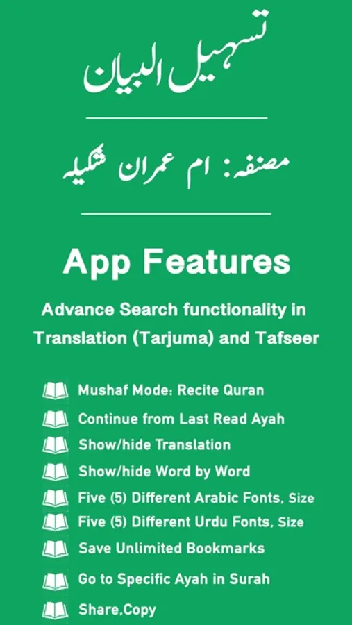 - Ability to show/hide Word by Word, Quran Translation (Tarjuma)