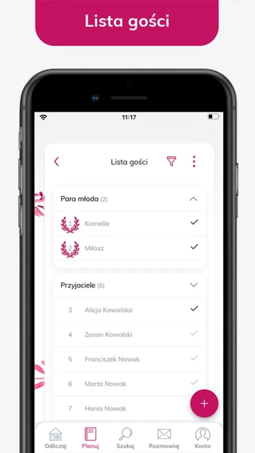 Stwórz także własną listę gości! Oprócz możliwości dodania gości, stworzysz także własne grupy, łącząc zaproszone osoby w oparciu o indywidualnie ustalone kryteria. Ponadto, w niezwykle prosty sposób określisz potrzeby każdego z gości, takie jak konieczność zapewnienia noclegu lub transportu oraz specjalnej diety. Dodasz również informację o potwierdzeniu obecności na Waszym weselu.