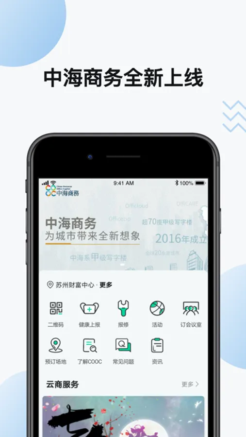 COOC中海商务集合旗下中海中心、中海国际中心、中海财富中心、中海广场和中海大厦五大甲级写字楼产品线,联合办公品牌OFFICEZIP、综合商办服务品牌Officloud中海云商及定制化精装修产品OfficePR,形成完整、集约、多元的品牌矩阵,致力于打造以楼宇经济为核心的商务生态闭环,助力区域经济升级转型,激发城市经济活力,共创美好生活。