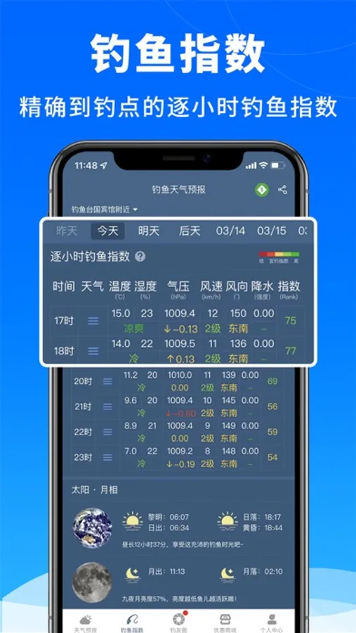 软件是基于钓点位置的钓鱼天气查询工具,精确到钓位!综合天气、温度、气压、湿度、风速、风向、降水、月相等10+项鱼儿活跃相关因素的逐小时、逐天(24小时X14天)钓鱼指数查询。