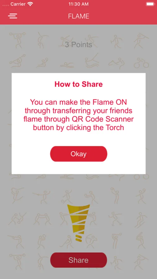 My Flame App : Each user need to register to this app. Account will be created with a torch. User need to get a flame from by other user through QR code or NFC. Upon receiving, you torch will start showing up the flame. Yep you are ready to spread the flame throughout the world. Upon initiating you can share flame to any user with this app.