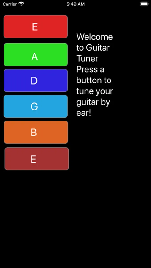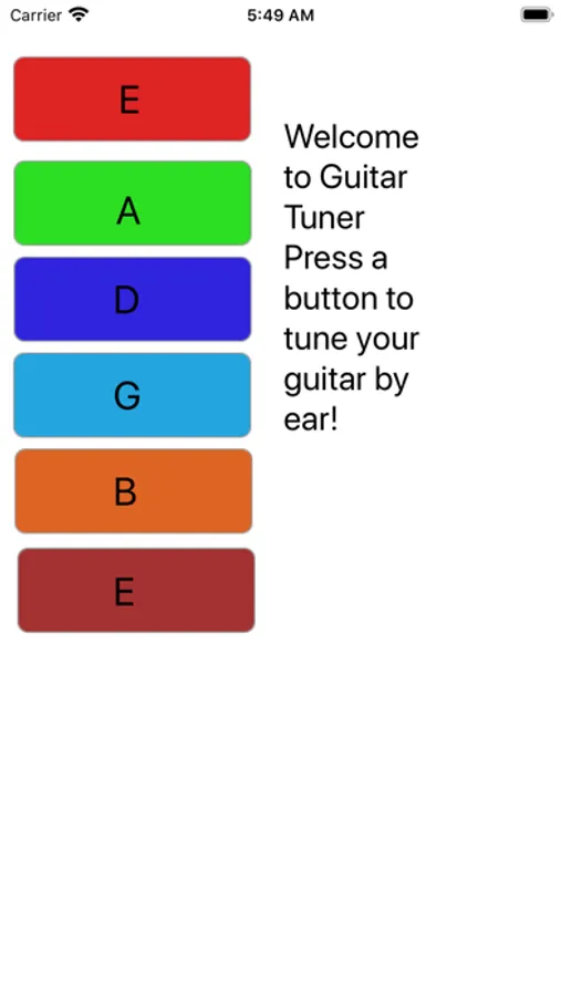This simple app uses six buttons, which let the user tune their guitar by pressing the individual buttons, listening, and tuning along with the sound. It's that easy!