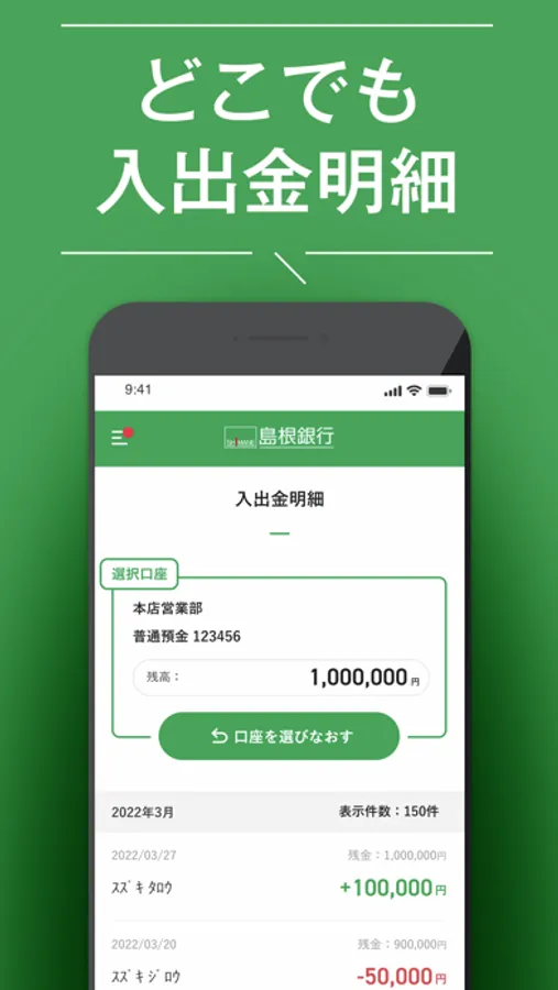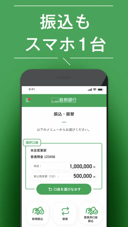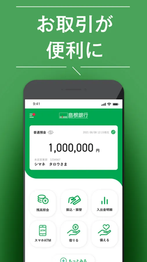 「しまぎんアプリ」では、口座残高や入出金明細の照会、振込・振替、定期預金の照会・預入・解約、住所変更、その他商品案内等各種コンテンツ(リンク)をご利用いただけます。