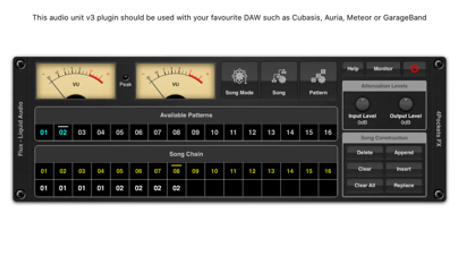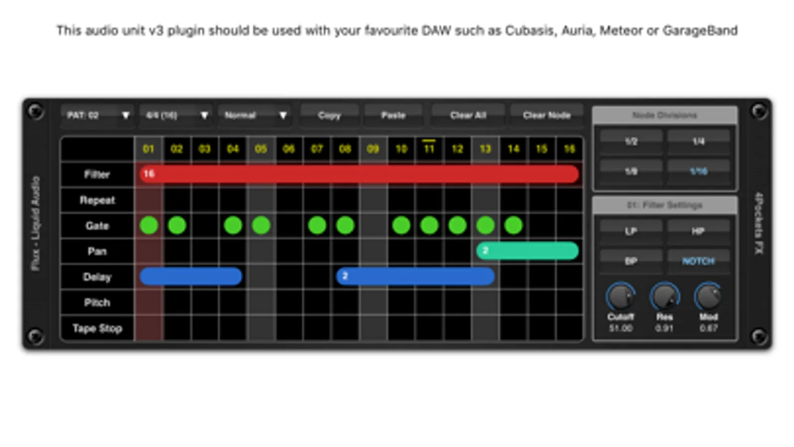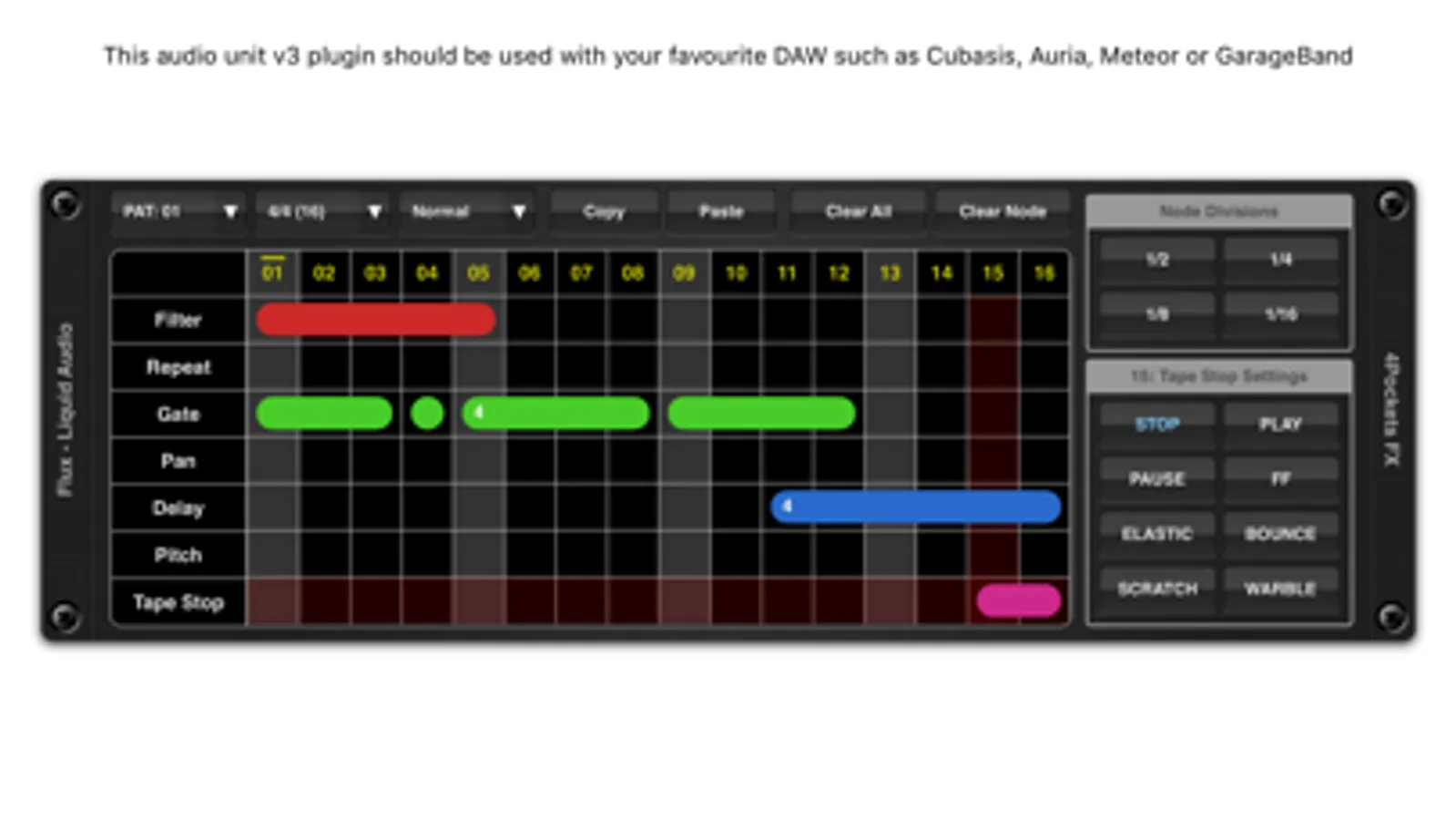 A pattern can be 16 to 64 beats in length and can be run at one of two speeds, standard or fast which is great for gate type effects. You can create up to 24 patterns which can be automated in any order along with your host DAW's beat position.