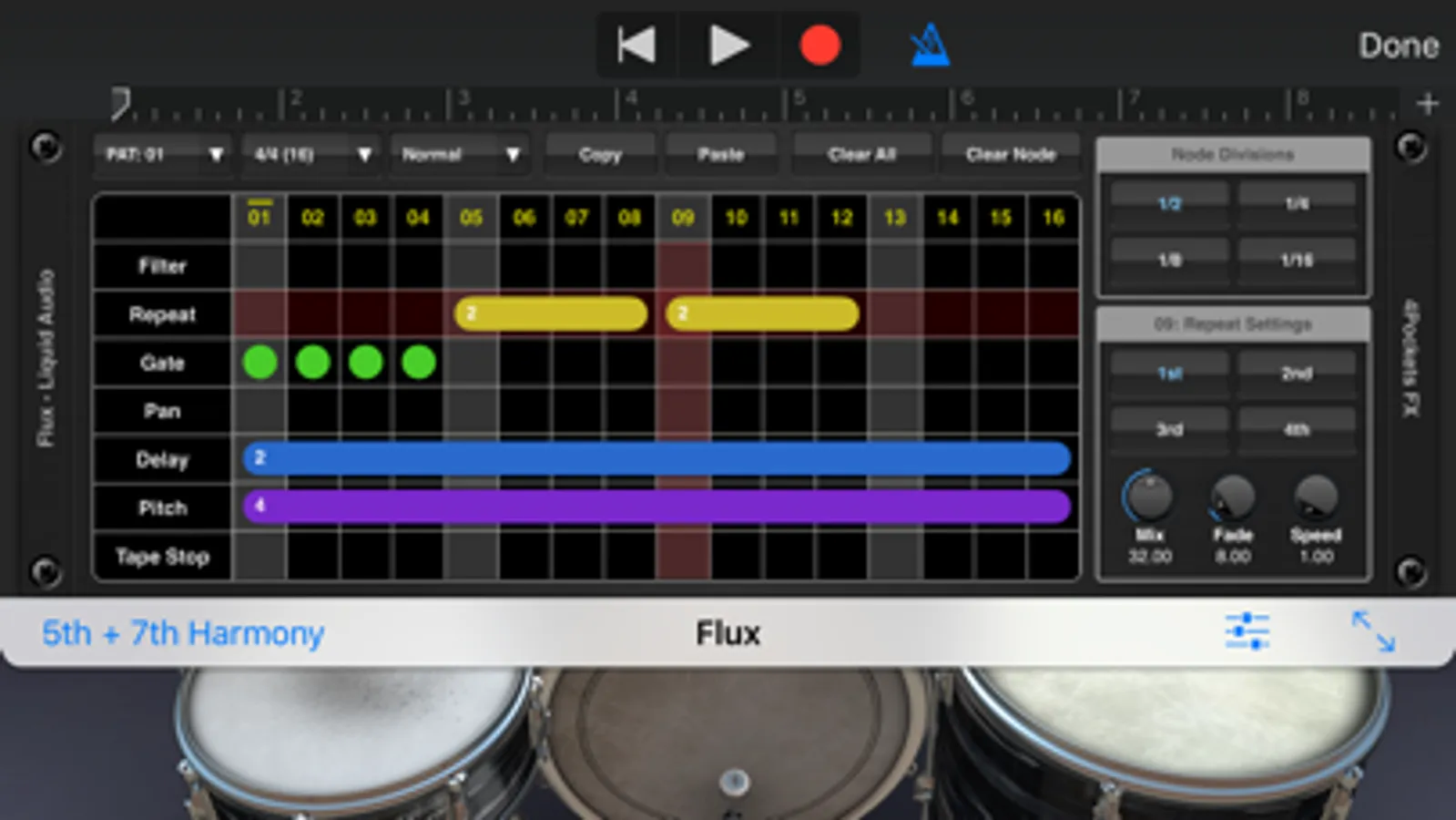 An effect is added using nodes. A 'node' is layed on the timeline over one or more beats, each node has its own unique settings. The node divisions control varying aspects of the effects such as number of repeats, delay time, modulation speed etc. all perfectly synced to the beat using the node division buttons.
