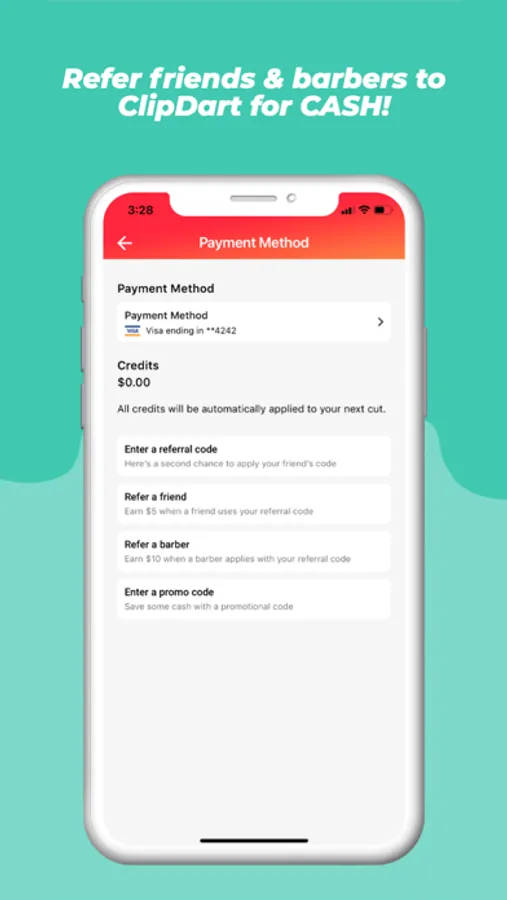We’re cashless. You can pay via credit or debit cards. Also, you can earn ClipDart Credits when a client or barber uses your referral code at signup!
