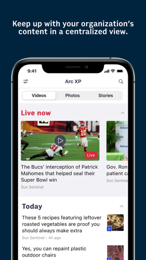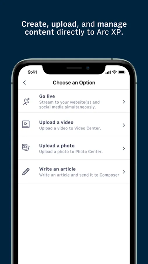 -Collaborate with your team leveraging the Arc Publishing platform. You can create live streams in the field, or record a video from your phone and upload it to the Arc platform. Your coworkers can access your stream and videos from the web.
