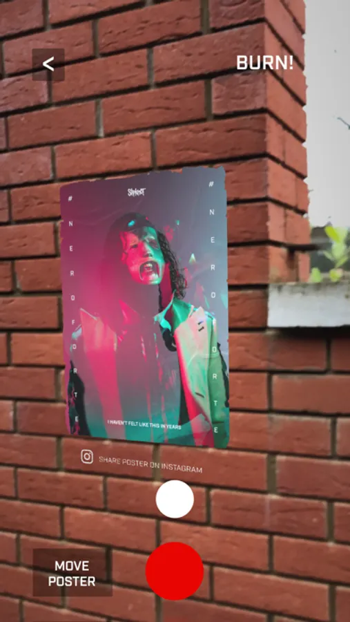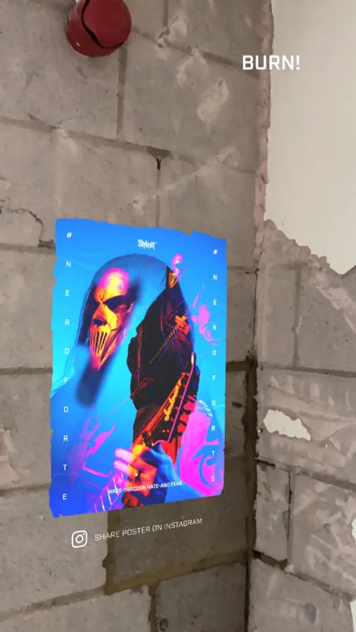 Help spread the word of ‘Nero Forte’!Join Slipknot and spread awareness for Nero Forte with this AR camera. Pick any of the 9 band member posters and pin them onto any surface and share it with the world. Once your poster has been placed, watch it light up in flames and burn away to reveal something…Think you have a great location? Share the poster to Instagram with #NeroForte and explore other great placements.