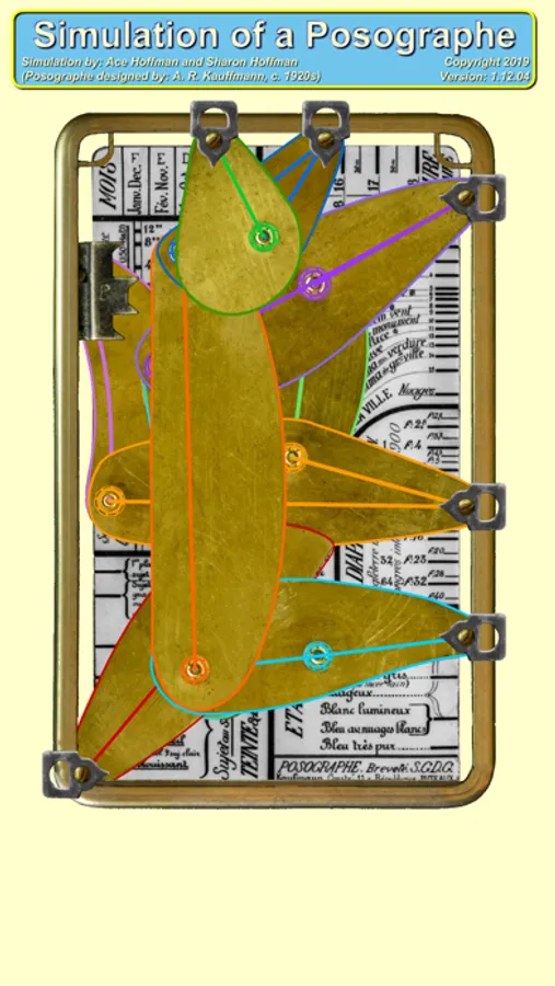 Kaufmann invented and patented several versions of the Posographe and a couple of other related mechanical contraptions. The mathematical theory behind how the Posographe works was conceived around the same time, and Kaufmann apparently had a number of correspondences with the mathematician who invented the theory. Although the theory is not explained here, the math behind the Posographe is illustrated with connecting lines, colored brass plates (or not, if you prefer!), circles indicating intersecting positions of the pieces, and various additional ways of exploring "under the hood."