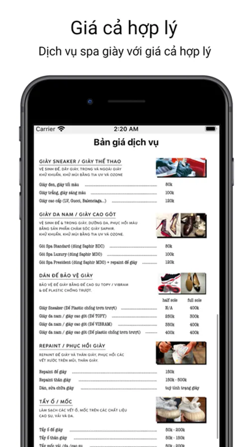 4) Dịch vụ chăm sóc chuyên nghiệp: Với dịch vụ bạn đã lựa chọn, các chuyên gia của chúng tôi sẽ chăm sóc giày của bạn với những sản phẩm chăm sóc cao cấp được nhập từ Mỹ, Pháp, Đức, Nhật Bản...