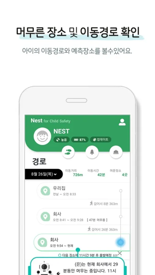 - 내 아이가 어디로 가고 있는지를 AI가 예측한 정보로 미리 확인할 수 있습니다.