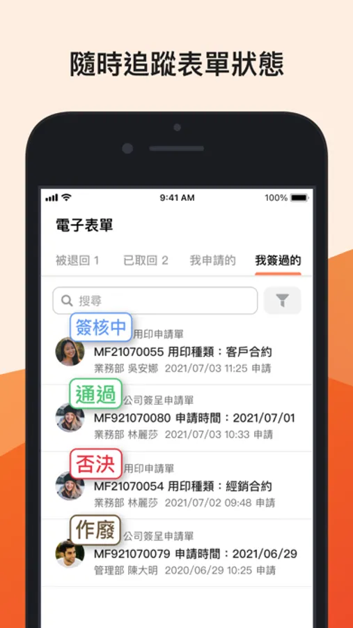 3、具備全方位BPM自動化工作流程表單的申請/簽核/追蹤/查詢,一手掌握流程進度,雲端辦公不設限。
