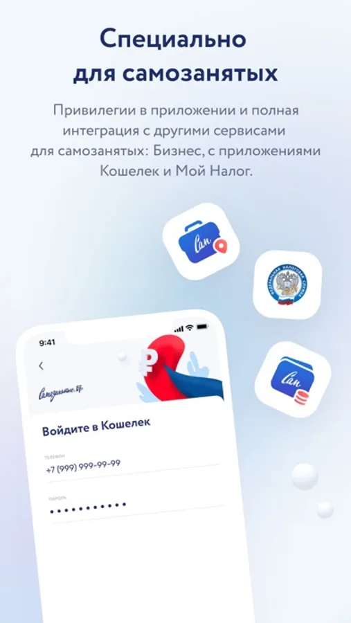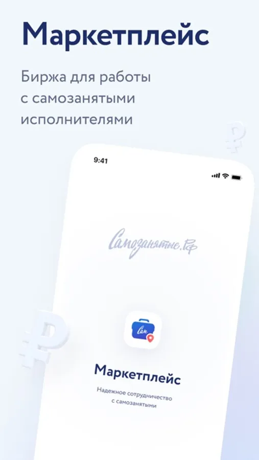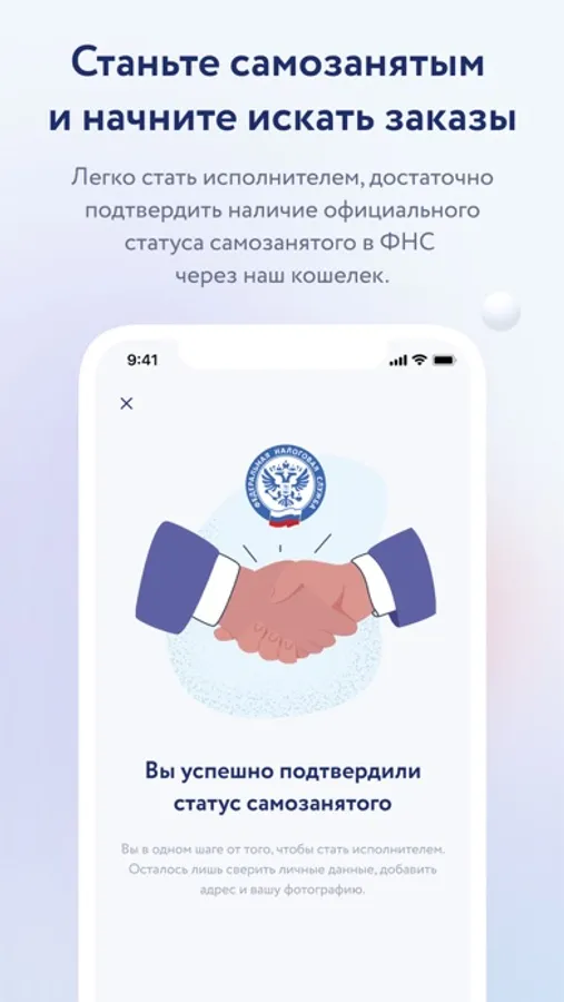 В нашем приложении можно стать самозанятым специалистом и работать в маркетплейсе. При регистрации в качестве исполнителя нужно подтвердить наличие официального статуса самозанятого в ФНС.
