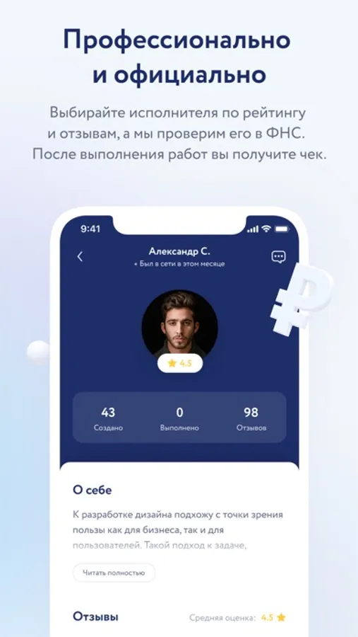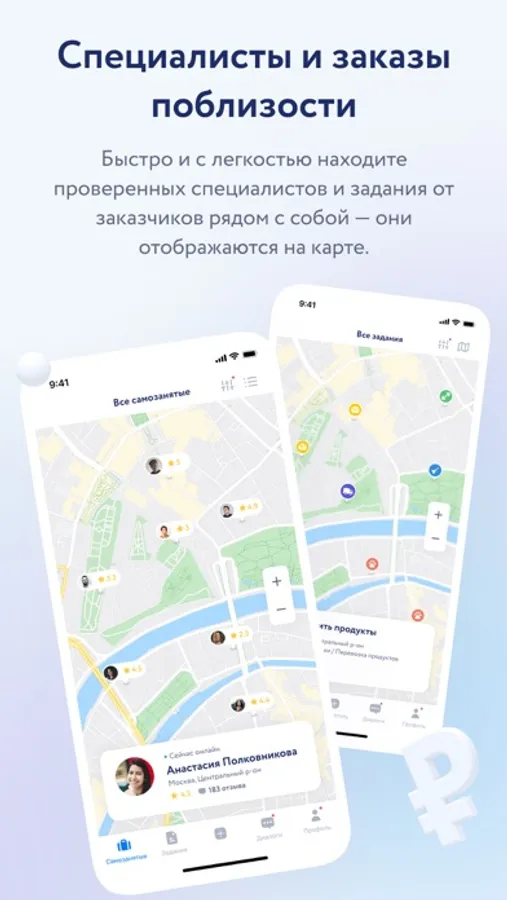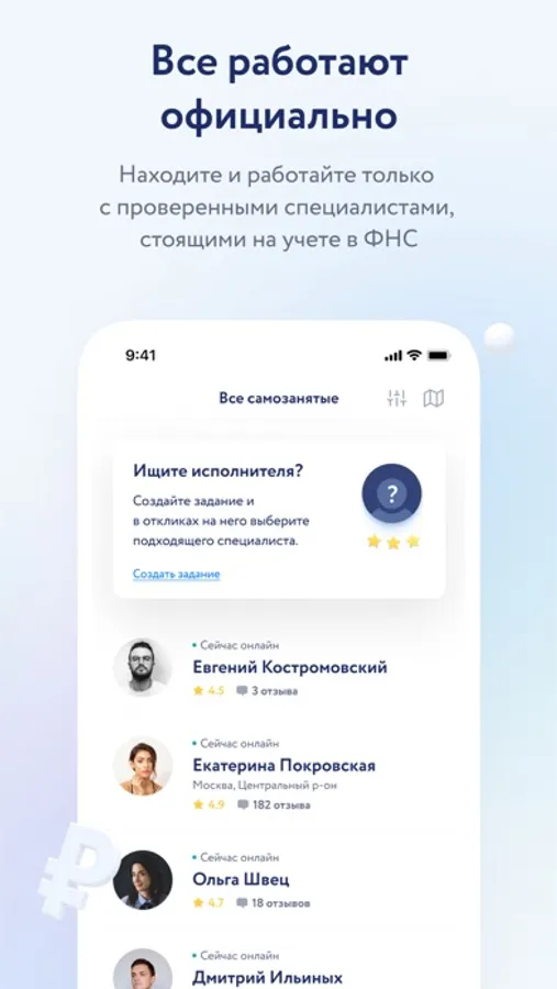 В приложении доступен поиск исполнителя поблизости на карте - это просто и удобно. Выбирайте и работайте только с проверенными исполнителями, состоящими на учете в ФНС, а после завершения работы получите чек от самозанятого.