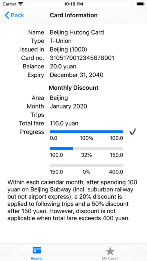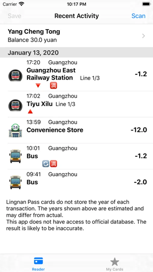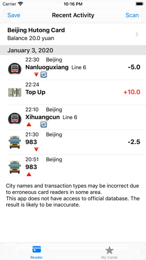 Trip Reader uses iPhone's internal NFC reader to get balance and history from public transit cards issued across China. No Internet or Bluetooth is needed.