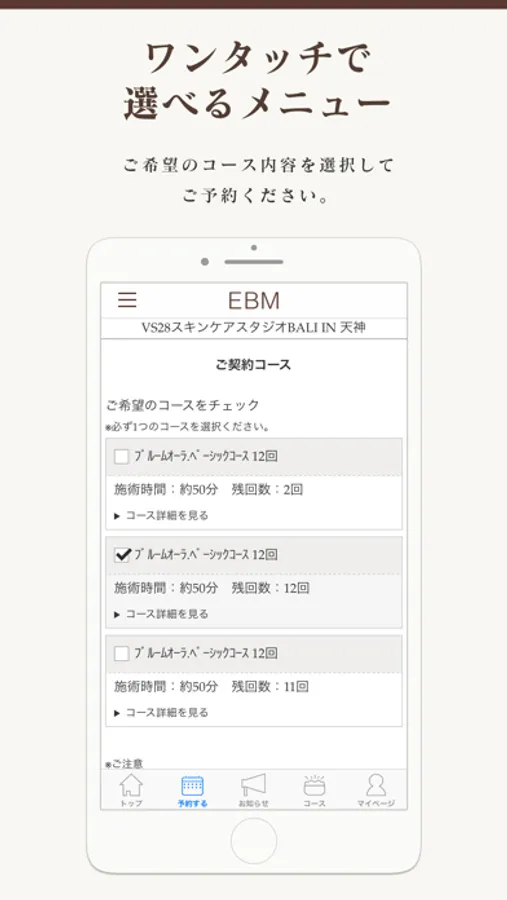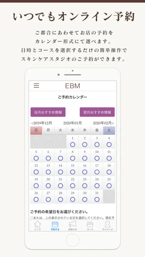日時とコースを選択するだけの簡単操作でスキンケアスタジオのご予約ができます。