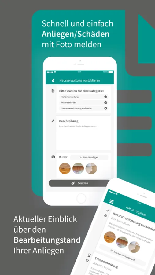 Als Mieter oder Eigentümer können Sie Schäden oder Anliegen direkt mit Fotos über unsere App melden. Ihre Anfragen stehen unseren Mitarbeitern dann zur Bearbeitung zur Verfügung und können auch an Handwerksbetriebe weitergeleitet werden.
