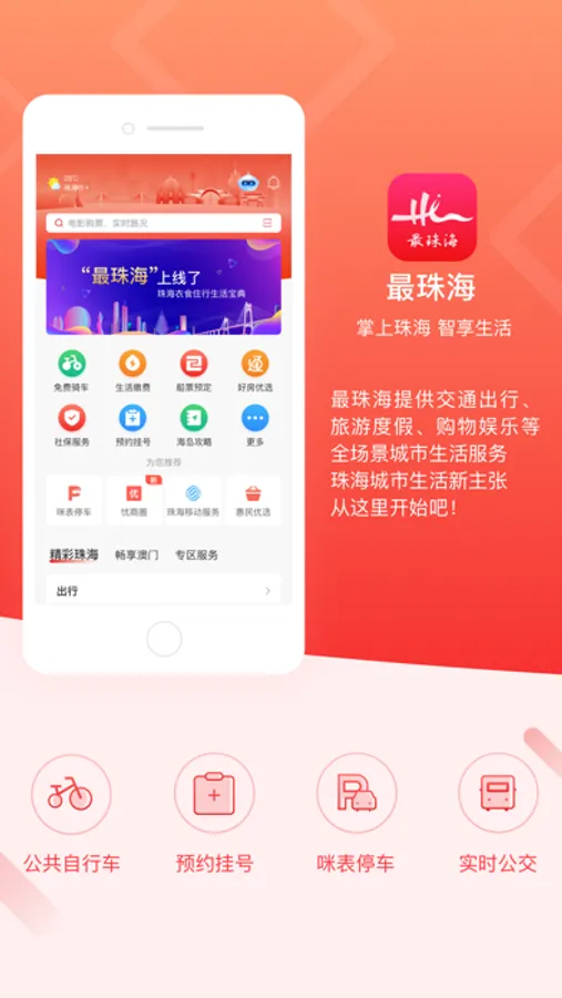 最珠海是一款珠海城市生活服务平台产品,面向珠海本地市民、往来珠海粤港澳大湾区居民及游客提供“医、学、住、行、游、购、娱、政”全场景城市生活服务。
