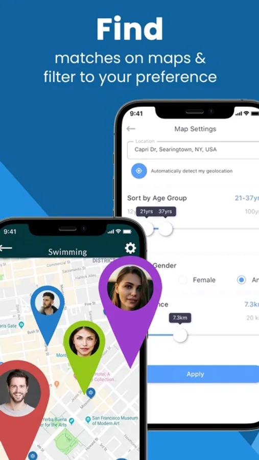 - Filter and sort matches by Distance, Location, Gender, and Age-group.