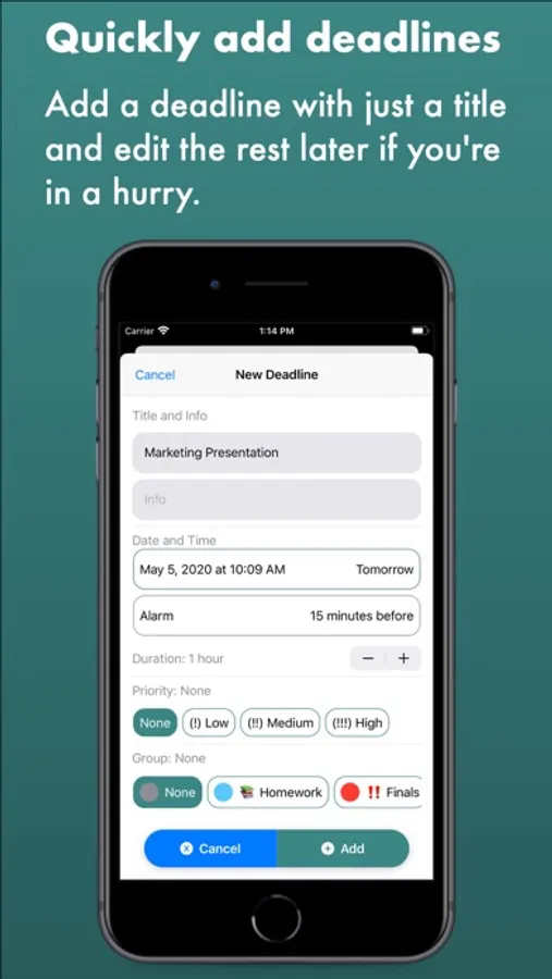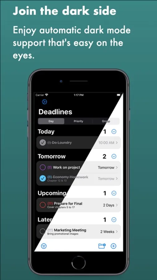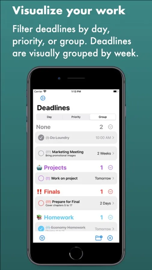 Deadlines is a modern, productive task manager tool to help organize your daily list of jobs. You can create custom groups to separate your tasks however you like, such as by classes and projects. Boost your productivity with the following features: