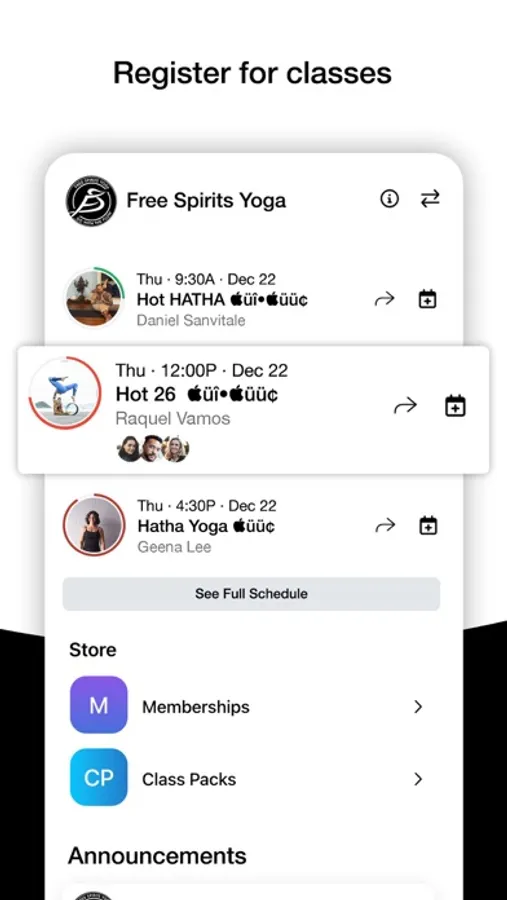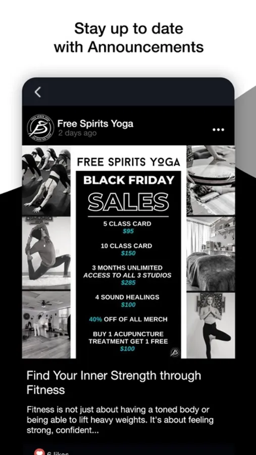 Download the Free Spirits Yoga App to plan and schedule your classes! From this mobile App you can view class schedules, sign up for classes, view ongoing promotions, events, and workshops, as well as view the studios location and contact information. You can also click through to our social media pages.