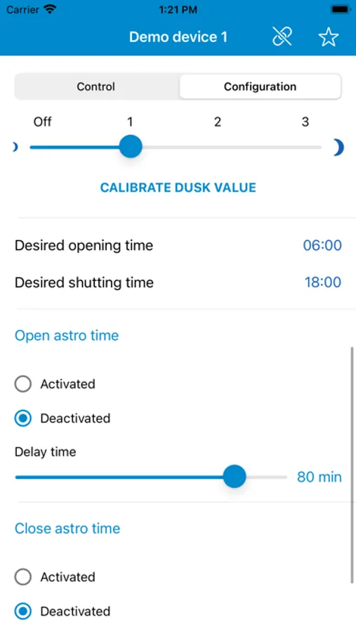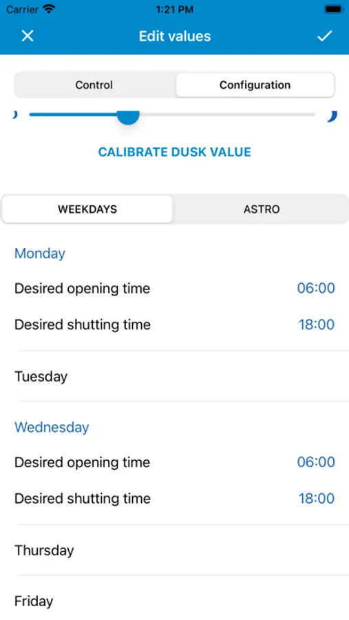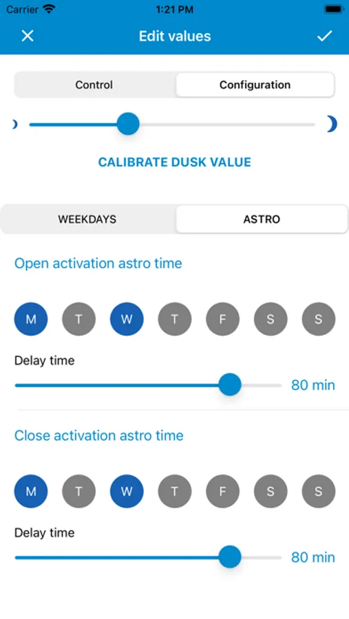 Full control thanks to the new Blind Timer app. Simply config- ure opening and closing times or activate the comfortable as- tro function. Sunrise and sunset are automatically determined and opening and closing times can be individually adjusted ±120 minutes according to your needs.