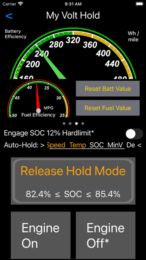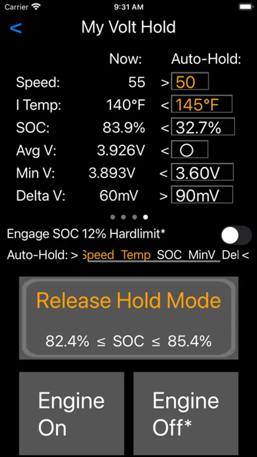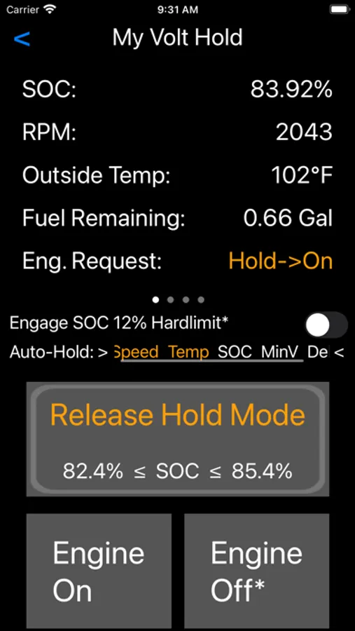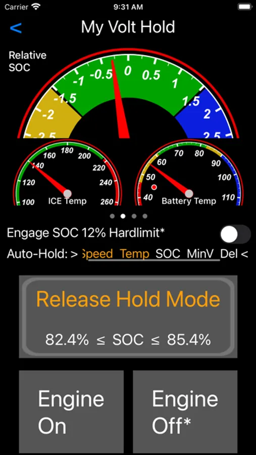 - Second, it allows you to turn on a "Hold" mode which approximates the Hold mode built into the car beginning with the 2013 model. This Hold mode turns on the internal combustion engine (ICE) as needed to try to maintain a State of Charge value that is close to the charge that was present when you turned the mode on. So why, you may ask, would I want that function on a newer car. Very simple really. Since Sport mode and Hold mode are mutually exclusive, this function allows you to use the car Mode button to engage Sport mode, while using the Hold function in this App to achieve Hold mode at the same time! Hold mode can also be automatically engaged based on State-of-Charge or vehicle speed.