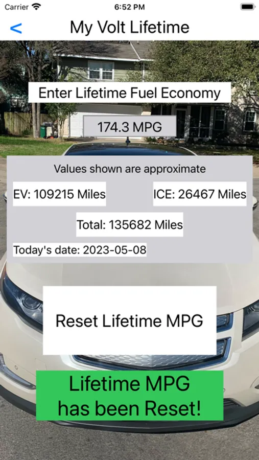 →> The Volt Lifetime function allows you to reset the lifetime fuel economy value ("Lifetime MPG" or "Lifetime L/100km") value for your car. You will find this useful if you've purchased a car which has recorded the previous owner's fuel economy results. You can also use this to calculate the distance travelled in both EV mode and on the ICE by entering the Lifetime Economy number shown on your dash.
