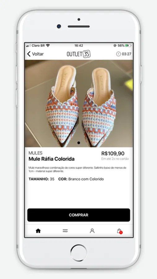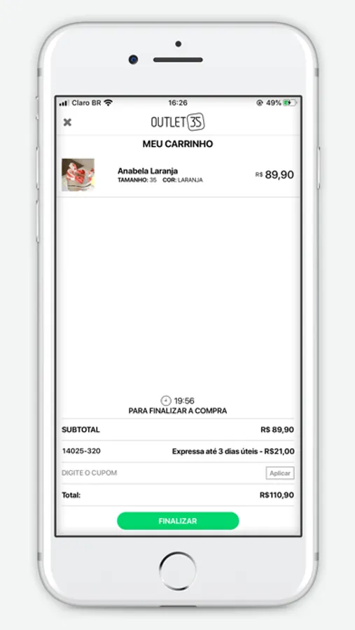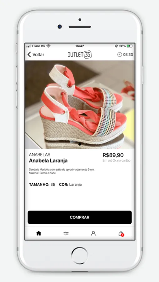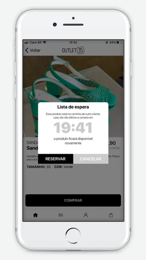 • Nosso aplicativo conta com cronometro que é iniciado a partir do momento que você colocar seu novo xodó no carrinho! Você terá 20 minutos para finalizar sua compra, pois como dito anteriormente somente temos um par de cada!