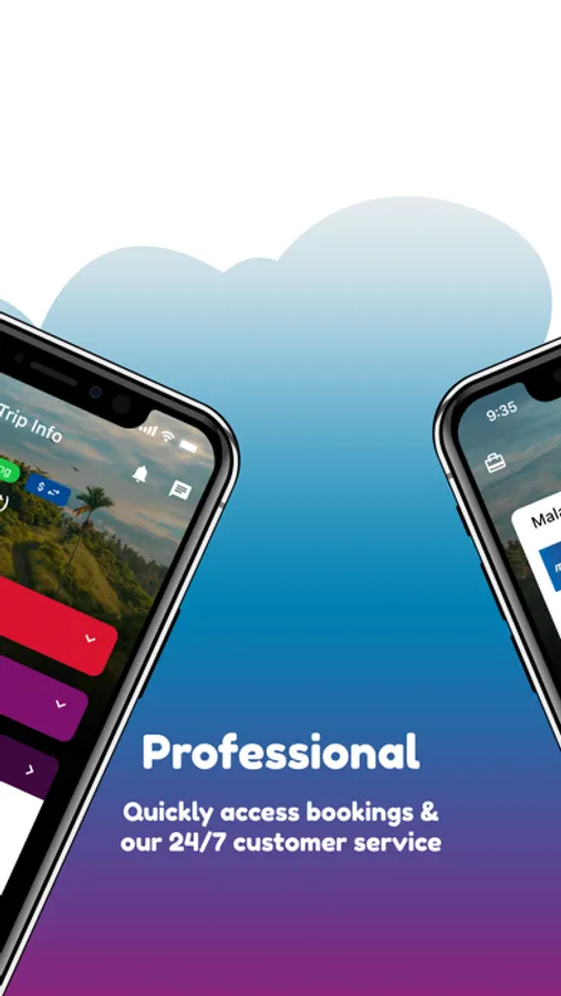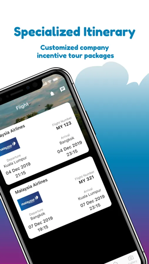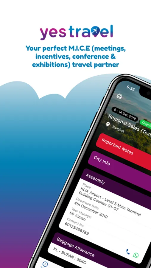 The app features trip details, itinerary, assembly time, flight information, baggage allowance, hotel information, currency, time zone etc.