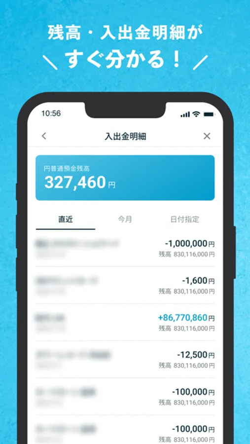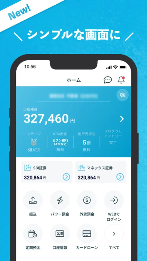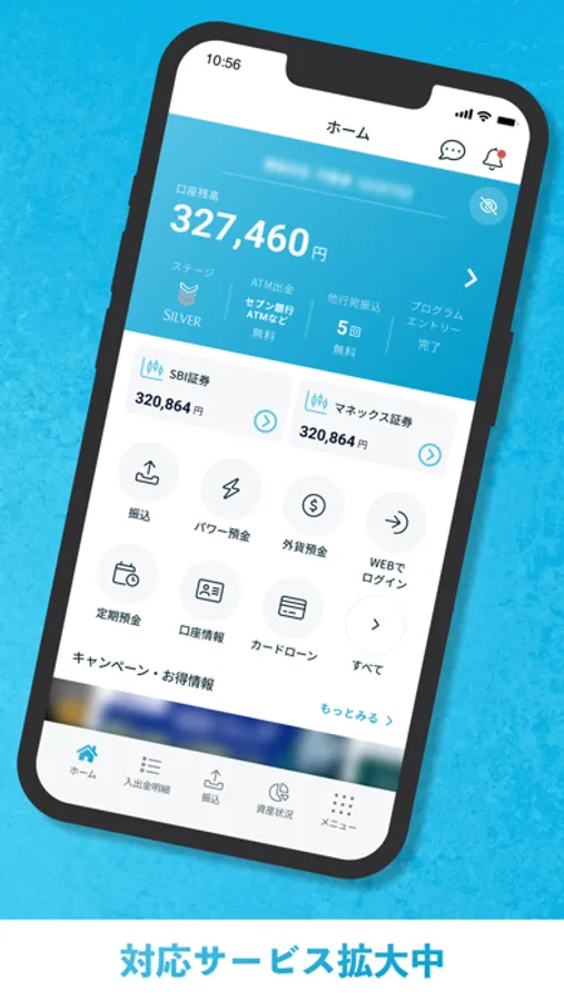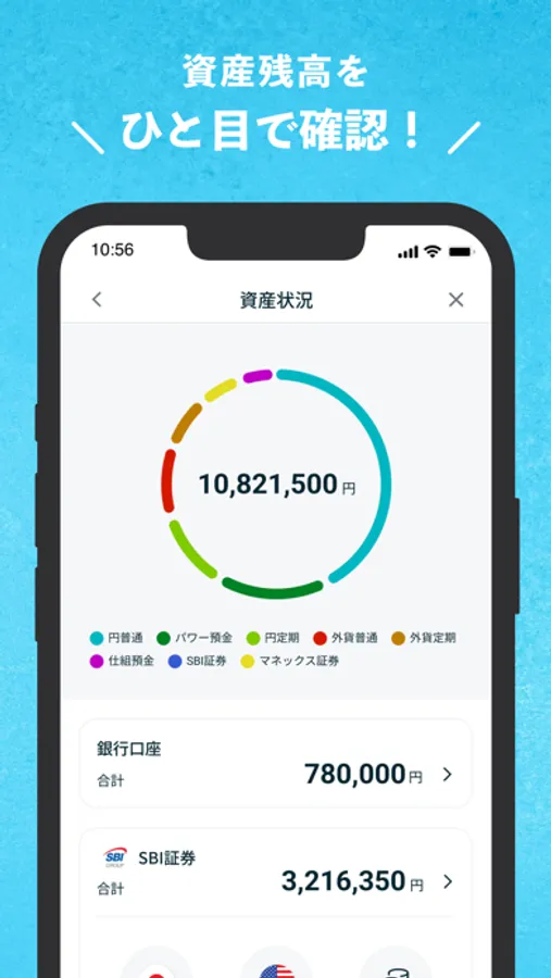 ■残高照会・入出金明細照会・普通預金残高はホーム画面ですぐに確認。さらに、資産状況画面では、銀行口座残高だけでなく、SBI証券やマネックス証券の口座をお持ちの方は、各証券口座残高を表示することができるので、ご自身の資産残高を一目で確認可能です。