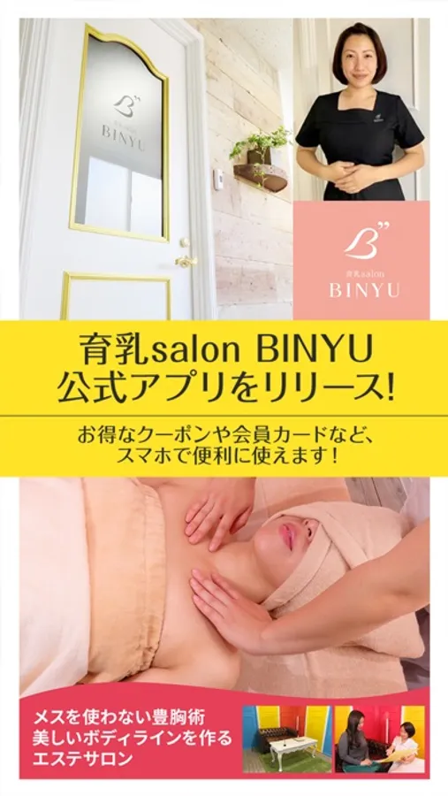 育乳salon BINYUでは、バストアップに加えて、痩身やフェイシャルなど、お客様・地域の声を反映したサービスを展開しているサロンでメスを使わない豊胸術『ミラクルバスト』による施術を提供しています。