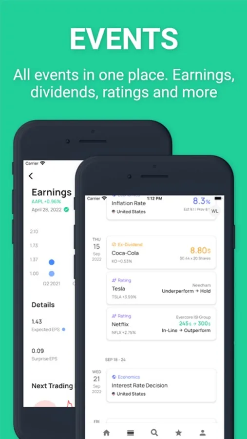 Stock Events helps you stay informed about upcoming earnings, dividends, IPOs, economic events and news of your favorite stocks. Never miss any new earnings report by receiving dedicated push notifications.