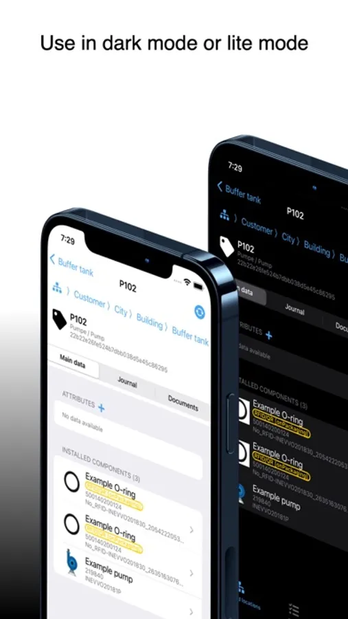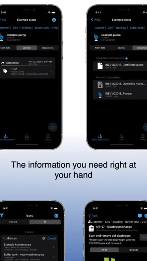 The app supports by identifying components with RFID and/or QR Code technology and provides functionality for paperless maintenance within the CONEXO system.