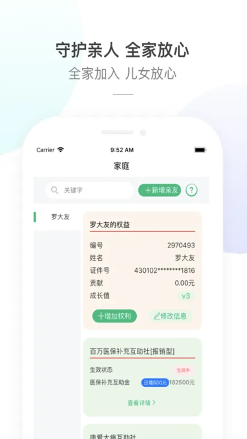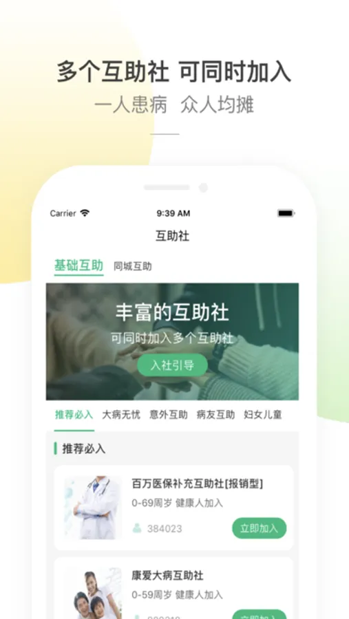 全家守护:30+互助社可供选择,满足不同人群的多样需求;根据家人特质,帮TA加入互助社,增加额外保障。