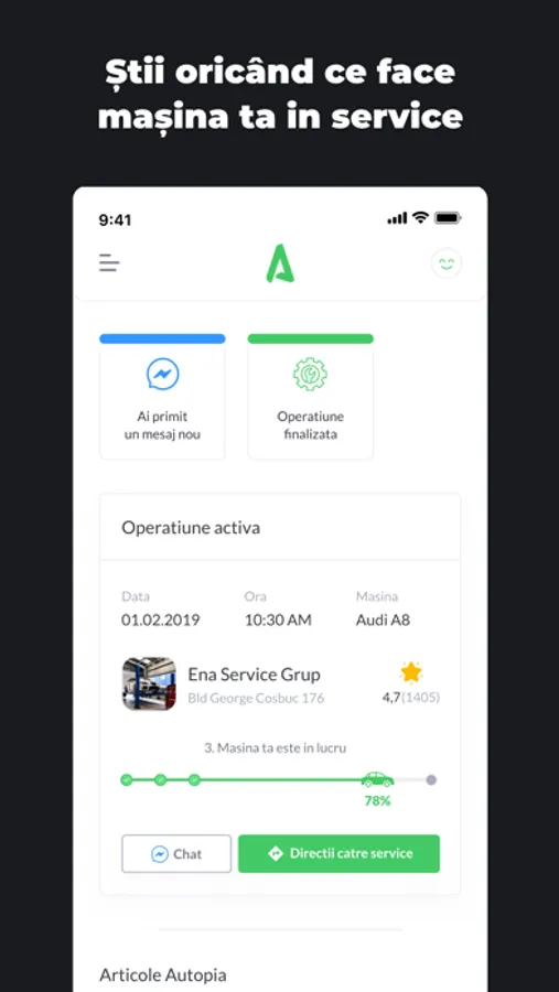 • Poți trimite mesaje, poze și documente service-urilor partenere prin intermediul chat-ului din aplicație
