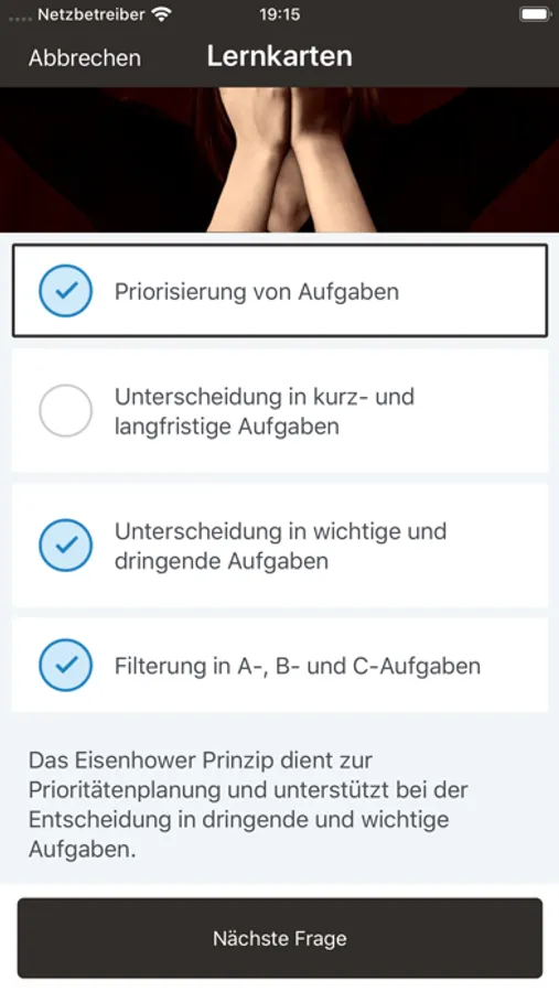 Und als dritte Möglichkeit wird angeboten, Wissen durch einen Test abzurufen, ohne davor explizit mit der Haider Akademie App gelernt zu haben.