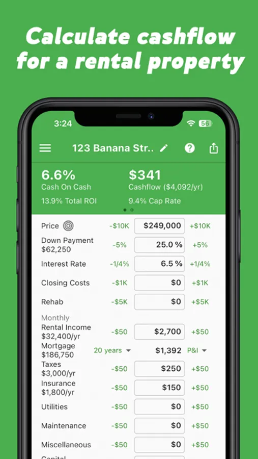 - Calculates cash-on-cash, cashflow, cap rate, and total ROI