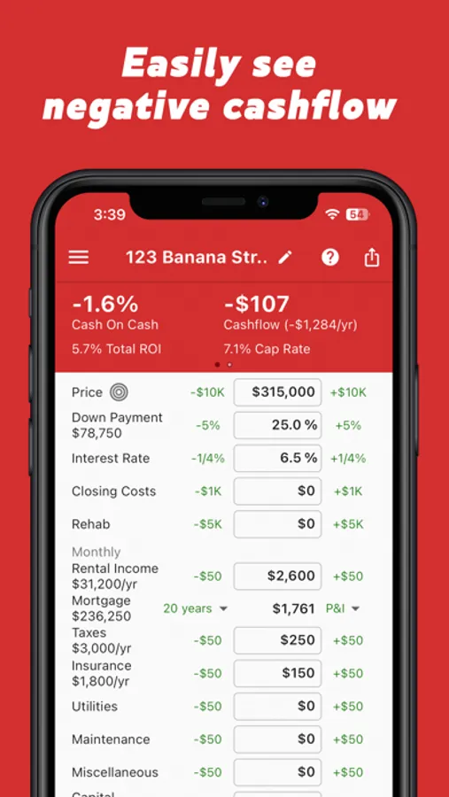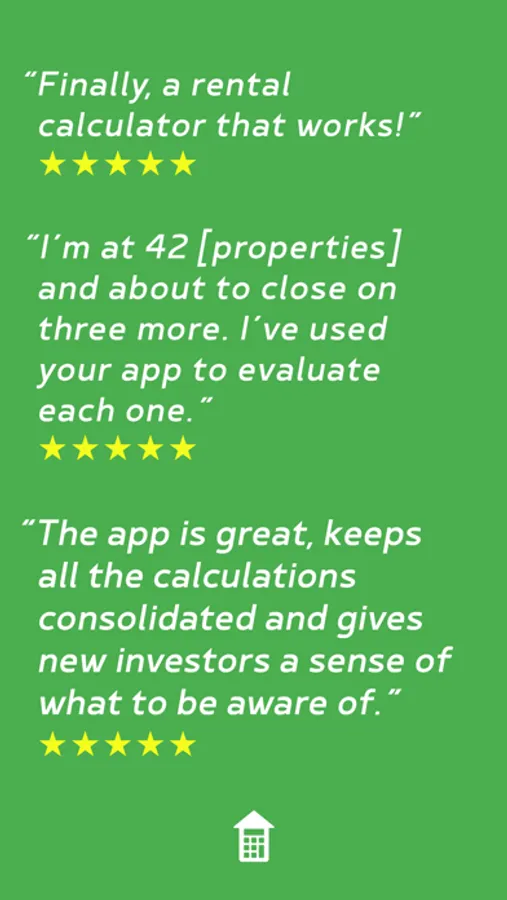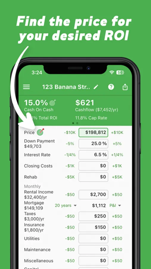 See your projected return-on-investment (ROI) as you enter details about the rental property. Then make adjustments to instantly see the impact and find your desired ROI. Over time, you'll get a feel for how each value can change the ROI, which will allow you to move quicker on finding the right deal.
