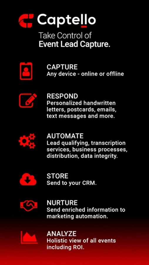 Captello™ is the industry's first fully-integrated mobile lead capture tool. Captello™ syncs directly to all leading CRM and Marketing Automation Platforms so you can begin nurturing your new prospects before you even leave the trade show floor. This app is perfect to use for outside sales prospecting, trade shows, seminars, conferences, and more. Best of all, Captello™ can work offline, no internet at your event, no problem!