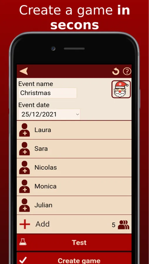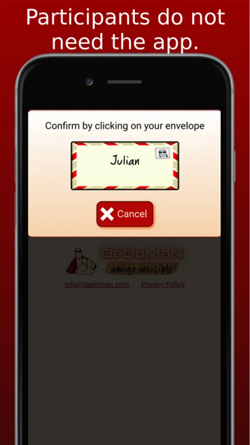 Introduce a list of names and let Dedoman relate them randomly. You can assign groups to candidates so people who belongs to the same group or "team" won't be assigned. This is useful when for example you are a group with several families and you don't want members of the same family buying between themselves.