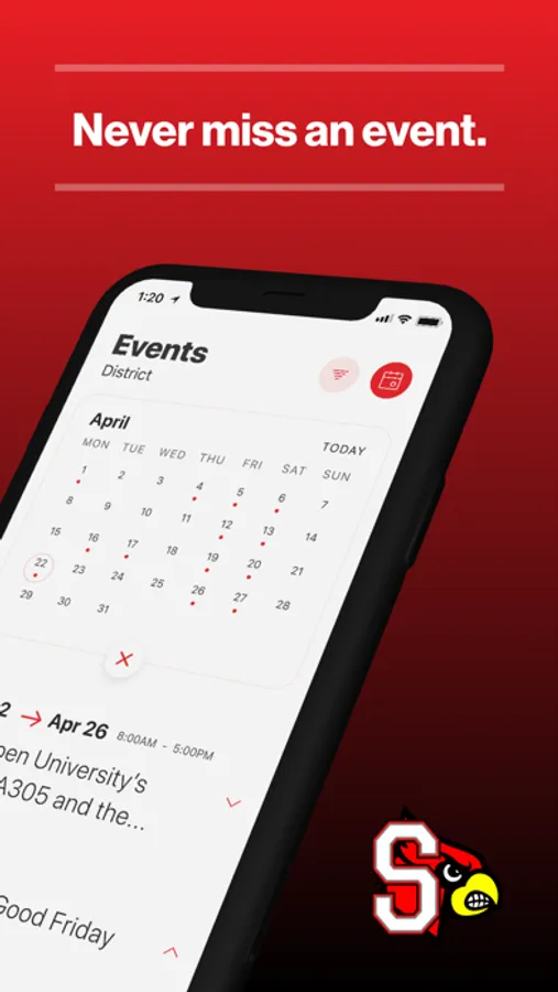 The event section shows a list of events throughout the district. Users can add an event to their calendar to share the event with friends and family with one tap.