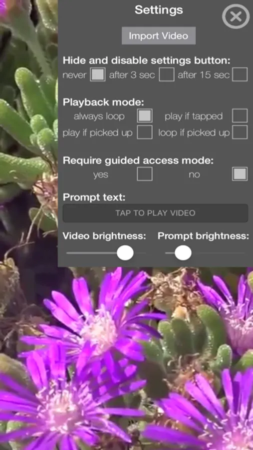 The 'settings' button can be configured to hide itself after a few seconds so that no interaction or changes are possible shortly after the app is started. It even includes an option to remind the user to turn on Guided Access Mode if it's needed.