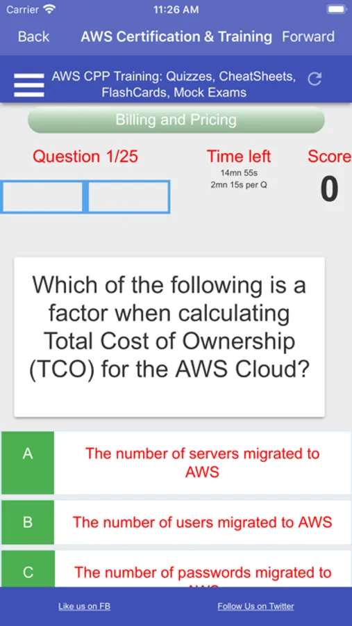 The questions and Answers are divided in 4 categories: Cloud Technology and Services, Security and Compliance, Cloud Concepts, Billing, Pricing and Support.