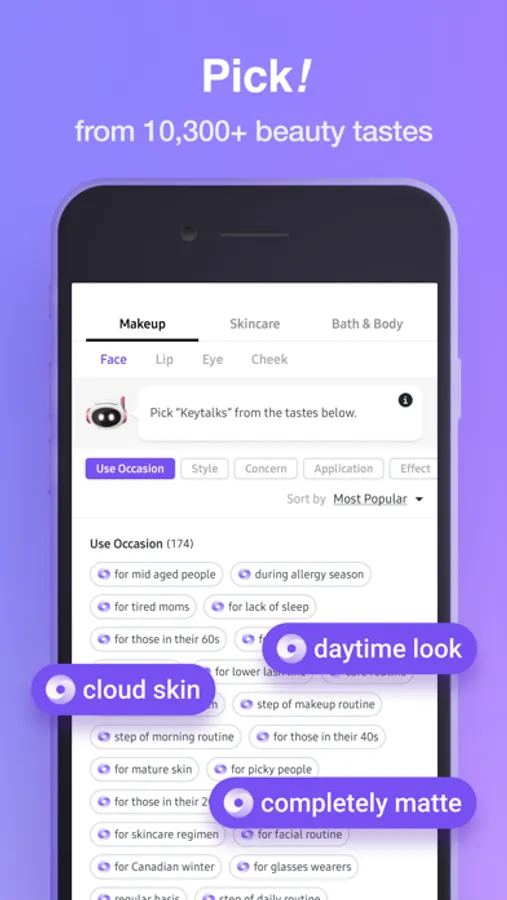 Powered by artificial intelligence (AI), Glamai provides over 10,400 beauty tastes based on “Keytalks” from people such as: