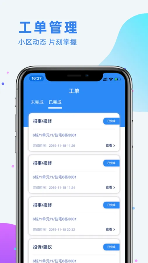 粤和物管包括巡检、工单、监控、业户查询、个人资料等功能。巡检功能可根据时间、地点、负责人员进行物业巡检巡查;工单功能可进行工单处理,及时处理业户问题;视频监控功能可以在线实时查看小区监控;业户查询功能可以查询业户具体信息,包括姓名、性别、手机号码等信息;个人资料可以随时修改个人信息、密码。