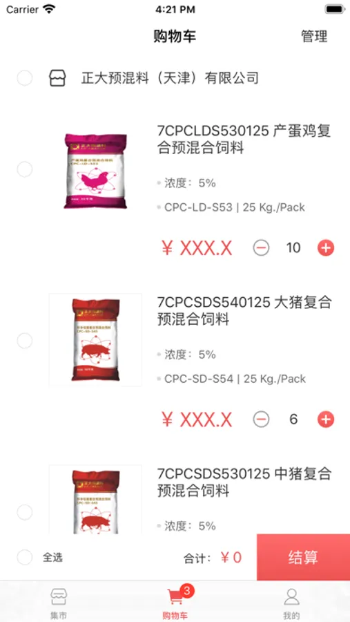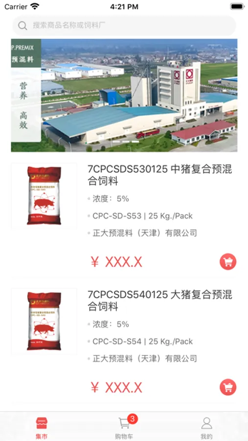 集市:是您专属的集市,可根据品类筛选、搜索快速找到目标饲料并快捷下单。