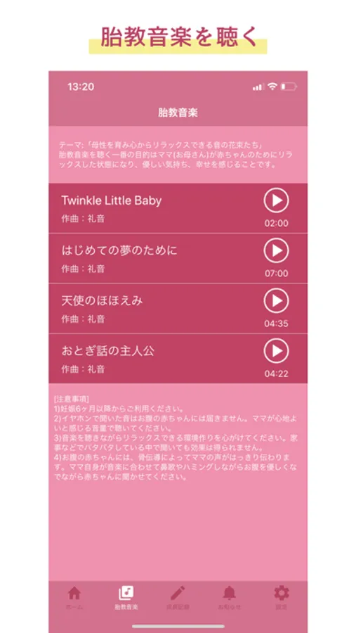 ・ 録音した心音、胎教音楽をiPhoneのスピーカーで聴くときは、マナーモードを解除してください。